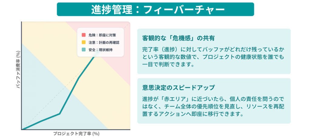 - 「事実」に基づく冷静な判断: 現場の「頑張ります」という根性論ではなく、バッファの残り具合という客観的な数値に基づいて、適切なタイミングでリソースの追加や優先順位の調整を行えるようになります。