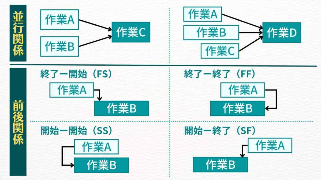 - 前後関係:あるタスクの開始・終了が、別のタスクに依存する関係です。
