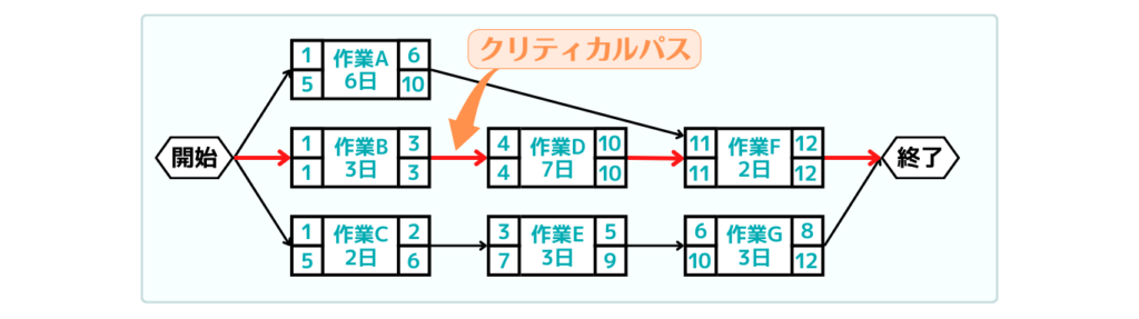 プロジェクトの開始地点から順に、「最速でいつ始められるか」を足し算で計算して前へ進みます。 前の作業が複数ある場合(合流地点)は、その中で最も遅い終了日が、次の作業の開始可能日となります。これにより、プロジェクト全体の最短工期が導き出されます。 (※今回の図では、最後のアクティビティである作業Fの「12日」が総所要期間になります)