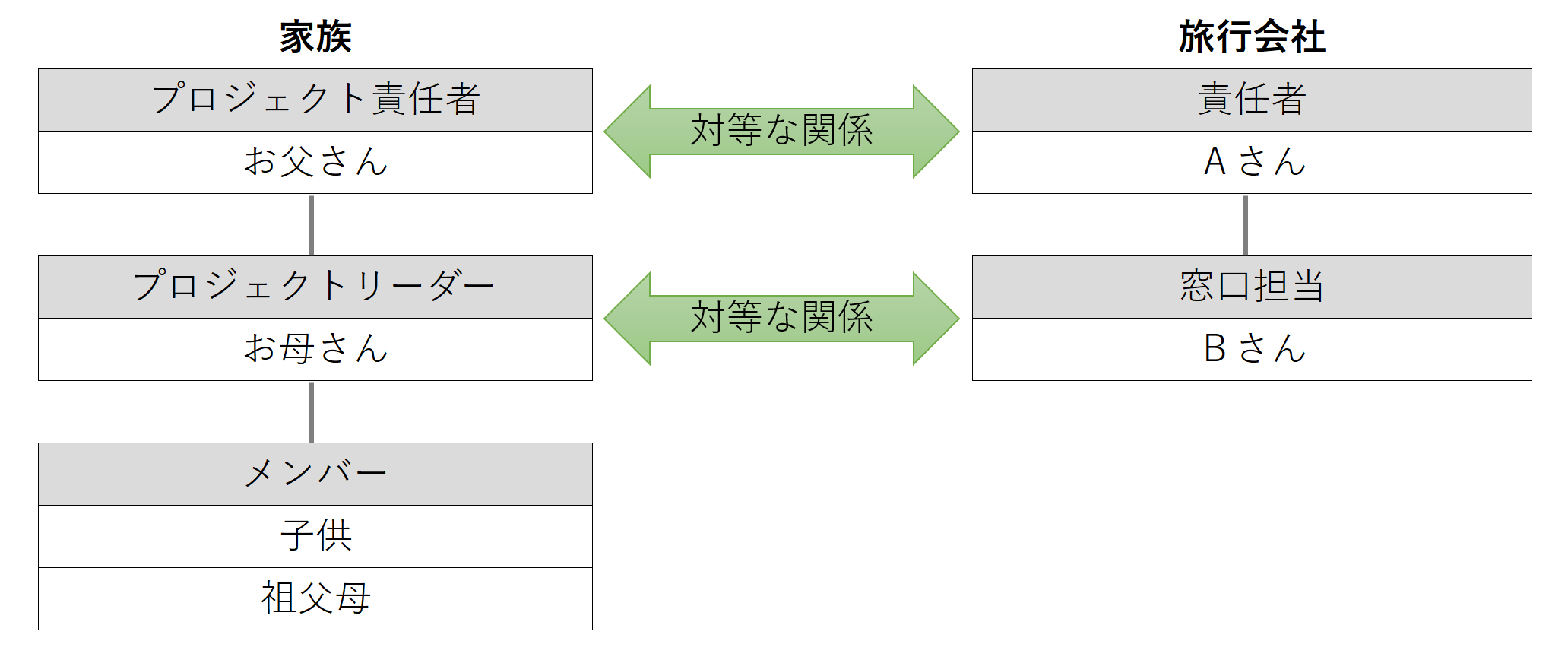 プロジェクトにおける主要な役割は、家族旅行の配役に置き換えると非常にイメージしやすくなります。