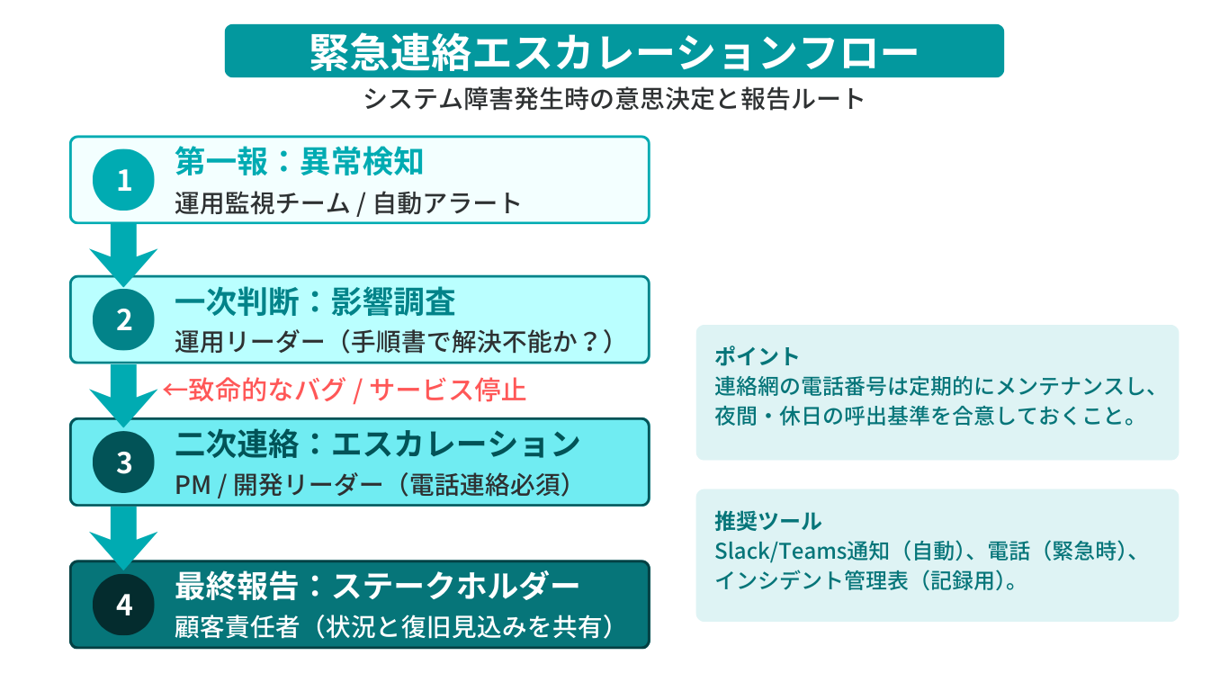 - 二次連絡(エスカレーション): 致命的なバグやサービス停止の場合、PMや開発リーダーへ電話で即時連絡。