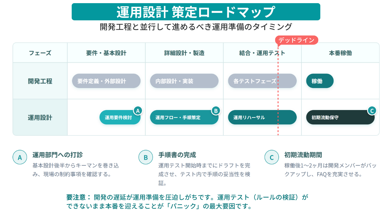 基本設計の後半から詳細設計に入るあたりで、「運用担当のキーマン」を一人アサインしてもらうか、定例会議に参加してもらうのが理想です。遅くとも「運用設計のドラフト」ができた段階で、必ずレビューを通しましょう。