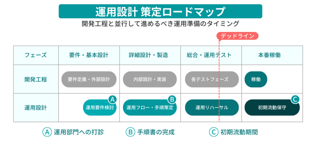 - 要注意: 開発の遅延が運用準備を圧迫しがちです。運用テストで「ルールの検証」ができないまま本番を迎えることが、パニックの最大要因となります。